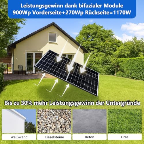 Maximale Energie – auch bei schlechtem Wetter – Die bifazialen N-Typ-Solarzellen nutzen Vorder- und Rückseite, um bis zu 30 % mehr Leistung zu erzielen. Selbst an bewölkten Tagen liefert Ihr Balkonkraftwerk 800W komplett Steckdose Speicher stabile Energie und bis zu 2 Stunden zusätzliche Stromproduktion pro Tag.
