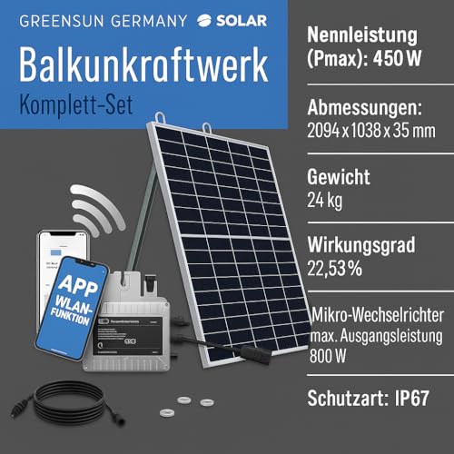 Premium-Komponenten für Ihr 800W Balkonkraftwerk – Komplett-Set bestehend aus: 2 × 450 W bifaziale Glas/Glas N-Typ-Module in elegantem Schwarz, stabilen Aluminium-Halterungen, 1 × 800W Wechselrichter sowie 1 × 5 m Anschlusskabel mit Schuko-Stecker. Ideal für Balkonkraftwerk 800W komplett Steckdose oder Steckersolaranlage 800W.