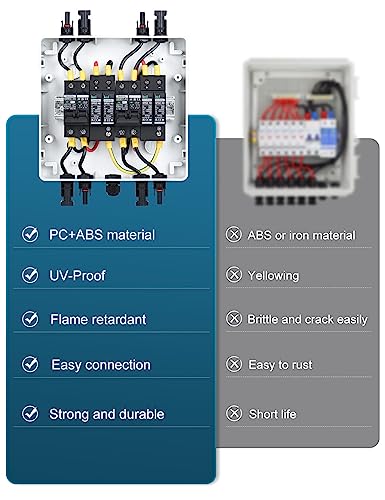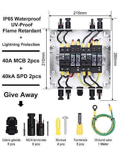 Überspannungsschutz:20-40kA 2P DC1000V,Verwenden Sie Standard Blitzschutz-Chip anstelle von Piezoresistor;Leistungsschalter:40A DC1000V 2-pilog,Silberkontakt,Flammhemmende Schale,Ausreichend Kupferspule; Gehäuse: IP65,PC Material PC-Materialien haben eine ausgezeichnete Korrosionsbeständigkeit und eignen sich besser für die Herstellung von Komponenten, die in rauen Umgebungen arbeiten als Eisen