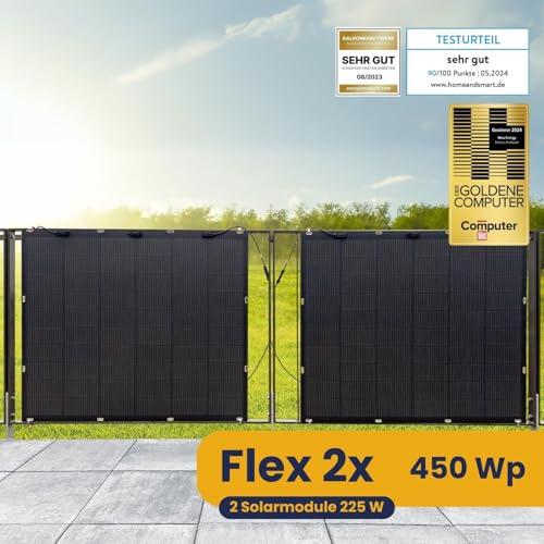Kleines Kraftwerk Flexibles Balkonkraftwerk 450Wp – Flexible Solarmodule 2×225W Set inkl. Wechselrichter & Anschlusskabel – Solarpanel Komplettset für Balkon, Zaun & Sonderflächen