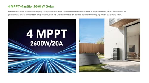 All-in-One-System mit hoher PV-Leistung und intelligenter Energieoptimierung: Integriertes All-in-One-Design mit maximaler PV-Eingangsleistung von 2600 W und 4 unabhängigen MPPT-Kanälen – für höchste Effizienz und optimale Energieausbeute bei wechselnden Lichtverhältnissen.