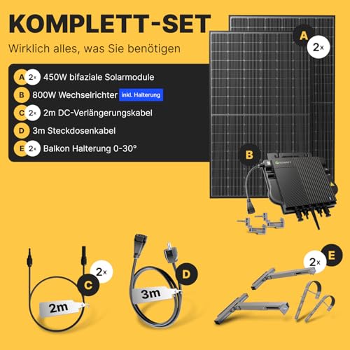 Solakon 900W Balkonkraftwerk mit Halterung (Balkon) – Balkonkraftwerk 800W komplett Steckdose – 800 Watt Wechselrichter – Solaranlage Komplettset – 450W bifaziale Solarmodule inkl. Zubehör – 3m Kabel