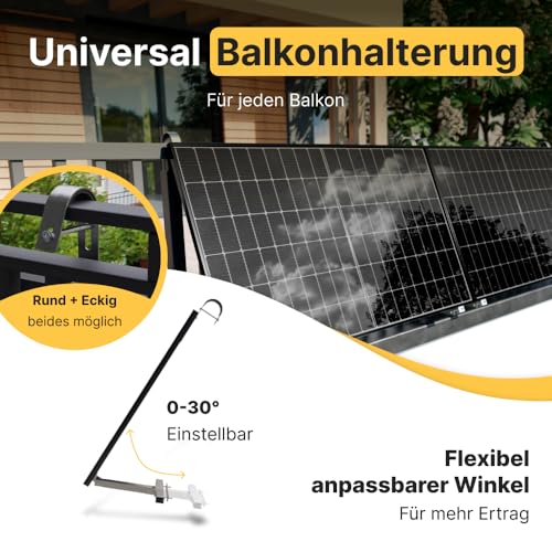 𝗕𝗮𝗹𝗸𝗼𝗻 𝗛𝗮𝗹𝘁𝗲𝗿𝘂𝗻𝗴 𝟬-𝟯𝟬° - Die Photovoltaik Komplettanlage wird mit einer universellen Halterung für Ihren Balkon geliefert. Die Halterung kann kinderleicht an fast jedem Balkon montiert werden. Der Winkel kann zwischen 0-30° eingestellt werden.
