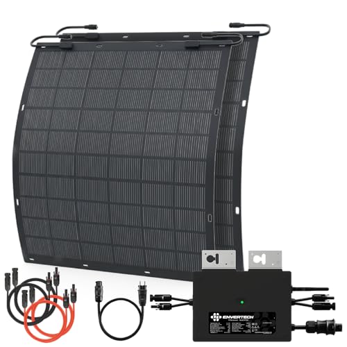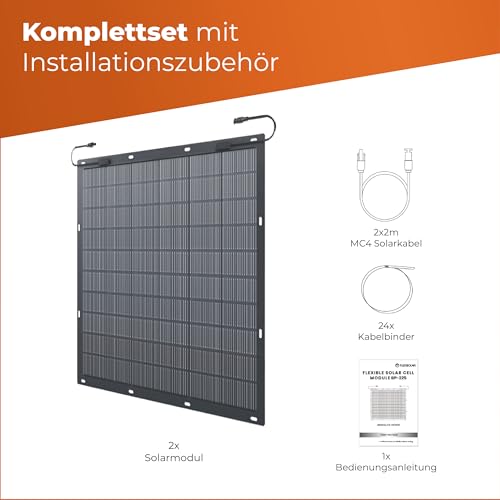Premium Komponenten - Bestandteile dieses Solarkraftwerks sind: 2 x 225W monokristalline flexible Solarpanels, 1 x Wechselrichter der Marke Envertech mit 800 Watt, 1 x Steckdosen-Kabel mit einer Länge von 5m, 4 x MC4-Stecker Solarkabelverlängerung, Kabelbinder für die Befestigung