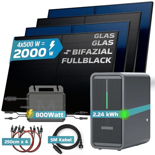 SUNNIVA® 2000W Balkonkraftwerk mit 2,24 kWh Speicher MARSTEK B2500-D, BIFAZIAL FULLBLACK komplett Steckdose, PV Solaranlage Komplettset mit Solarspeicher, 4x 500W N-Type Glas-Glas Bifacial Module
