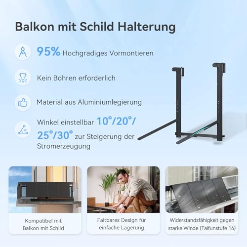 ✔ 95 % vormontierte Halterung – Installation in wenigen Minuten.Die Halterung ist nahezu vollständig vormontiert und lässt sich mit nur 8 Schrauben schnell montieren – kein Bohren erforderlich, eine Person genügt. Flexible Halterung mit 4 einstellbaren Neigungswinkeln (10°/20°/25°/30°), zur Maximierung der Stromerzeugung. Durch die optimale Winkeleinstellung kann der jährliche Ertrag um ca. 25–30 % gesteigert werden – für maximale Leistung bei jeder Sonneneinstrahlung.