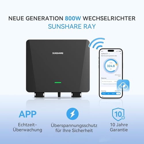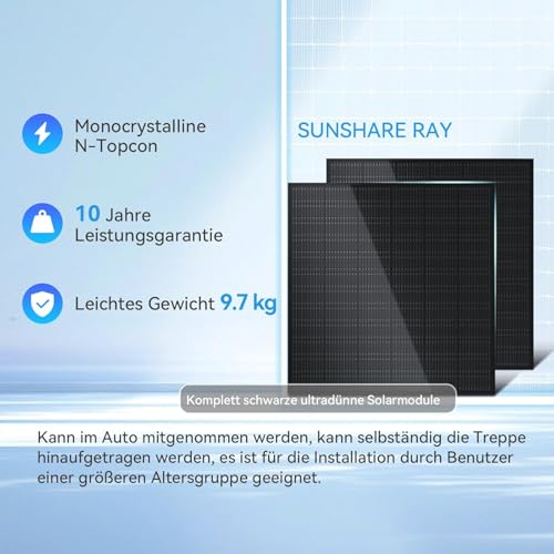 ✔ SUNSHARE Ray Balkonkraftwerk ohne Halterung – Die SUNSHARE Ray Serie ohne Halterung bietet maximale Flexibilität für alle, die ihre Solaranlage selbst gestalten und montieren möchten. Mit Sets von 855W bis 1140W und einem leistungsstarken 800W Mikro-Wechselrichter (inkl. Kabelsystem) ist das System plug & play einsetzbar.Wählbar sind leichte 285W Solarmodule, die sich einfach transportieren, flexibel kombinieren und frei positionieren lassen.