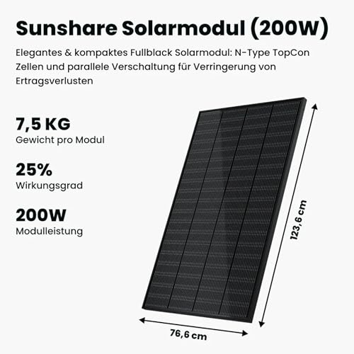 ✔ SUNSHARE Ray Balkonkraftwerk ohne Halterung – Die SUNSHARE Ray Serie ohne Halterung bietet maximale Flexibilität für alle, die ihre Solaranlage selbst gestalten und montieren möchten. Mit Sets von 200W bis 1200W und einem leistungsstarken 800W Mikro-Wechselrichter (inkl. Kabelsystem) ist das System plug & play einsetzbar.Wählbar sind leichte 200W Solarmodule, die sich einfach transportieren, flexibel kombinieren und frei positionieren lassen – perfekt für Balkone, Terrassen oder Dächer.
